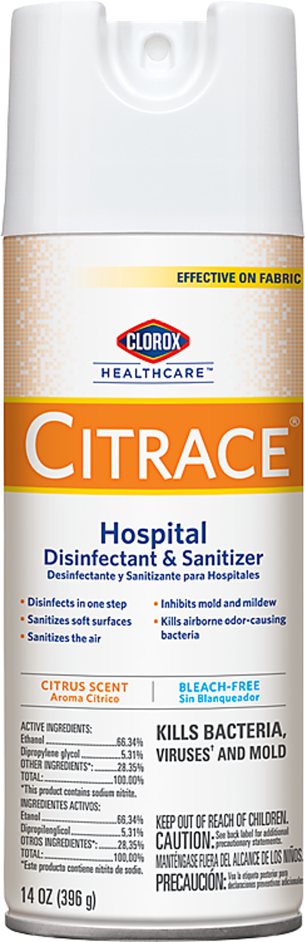 Protect hard and soft surfaces from dangerous pathogens. Eliminate odors instantly. Whether you use Citrace® Hospital Disinfectant & Sanitizer in a hospital, dental office or other facility, its germ-killing power and citrus scent will give you confidence that your surfaces are clean and refreshed.Help prevent the spread of pathogens that can contribute to HAIs. In just 30 seconds, you can kill dangerous bacteria on soft surfaces that might otherwise survive more than three months.*You can also disinfect hard, nonporous surfaces in 5 minutes, and inhibit the growth of mold and mildew on privacy curtains, upholstered furniture and other soft surfaces.All the while, you’ll be destroying odors, because Citrace® Hospital Disinfectant & Sanitizer kills the bacteria that cause them. Its light citrus scent disappears rapidly, leaving only a freshness behind.