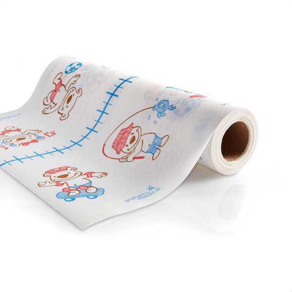 Cheerful character designs on exam table paper help younger patients feel more at ease. Strong, easy to use. Crepe finish.